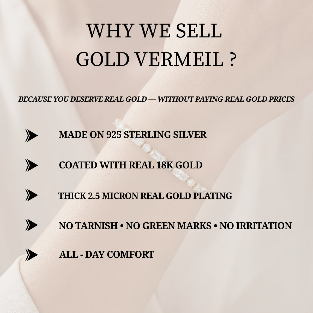 Our jewelry is made from premium S925 sterling silver with thick 18kt vermeil gold plating, giving you the luxurious look and feel of real gold without the high price tag.